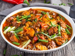 Рубленные куски курицы обжаренные до хрустящей корочки с добавлением чеснока, зелёного лука и перца чили. 250 г.